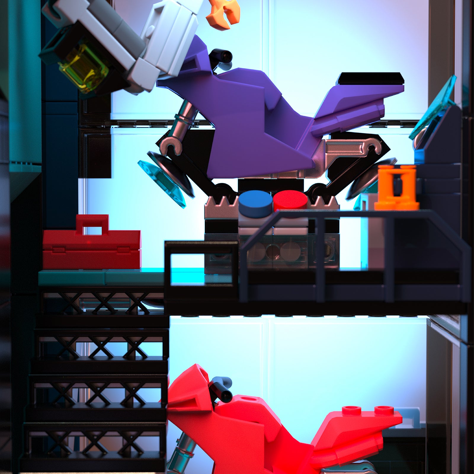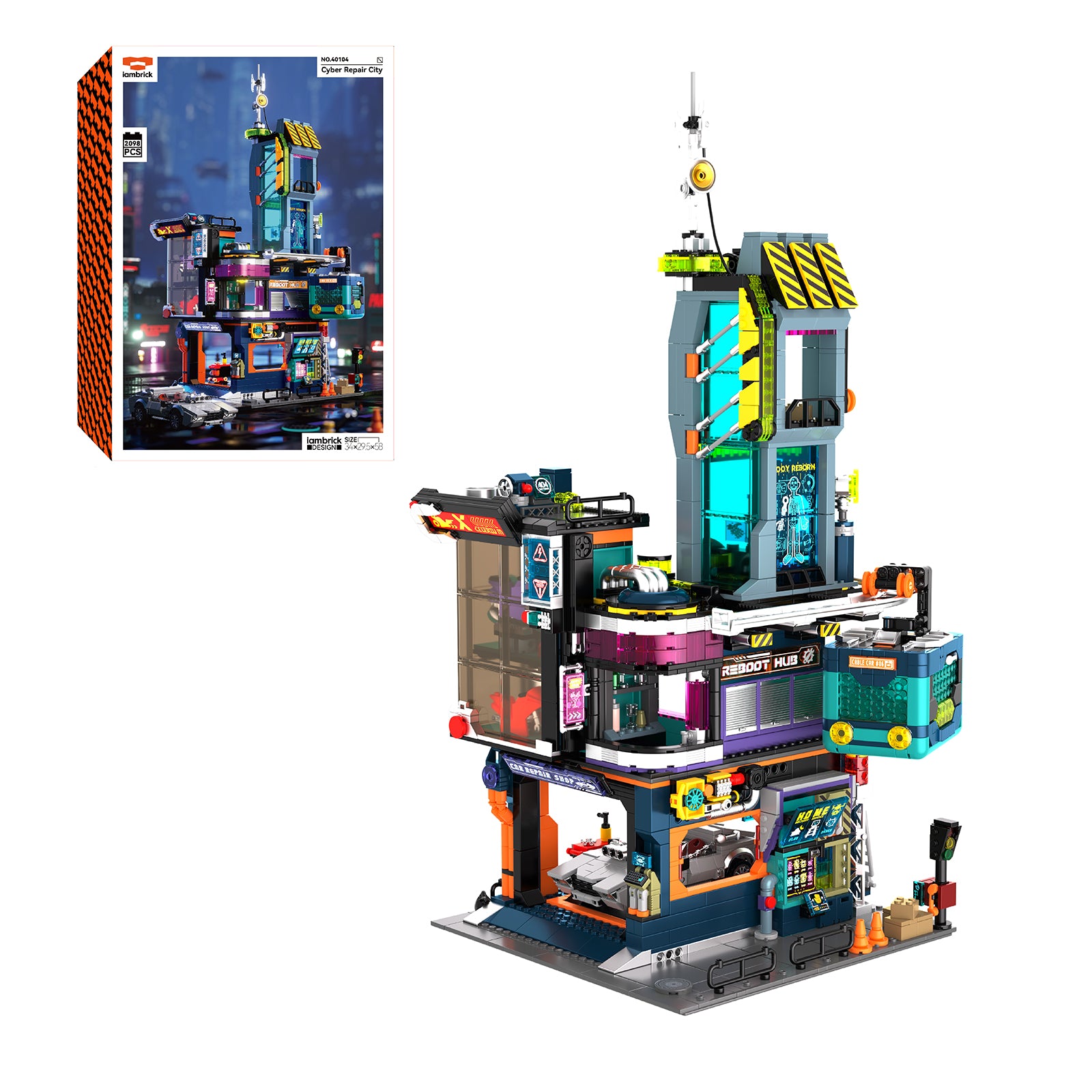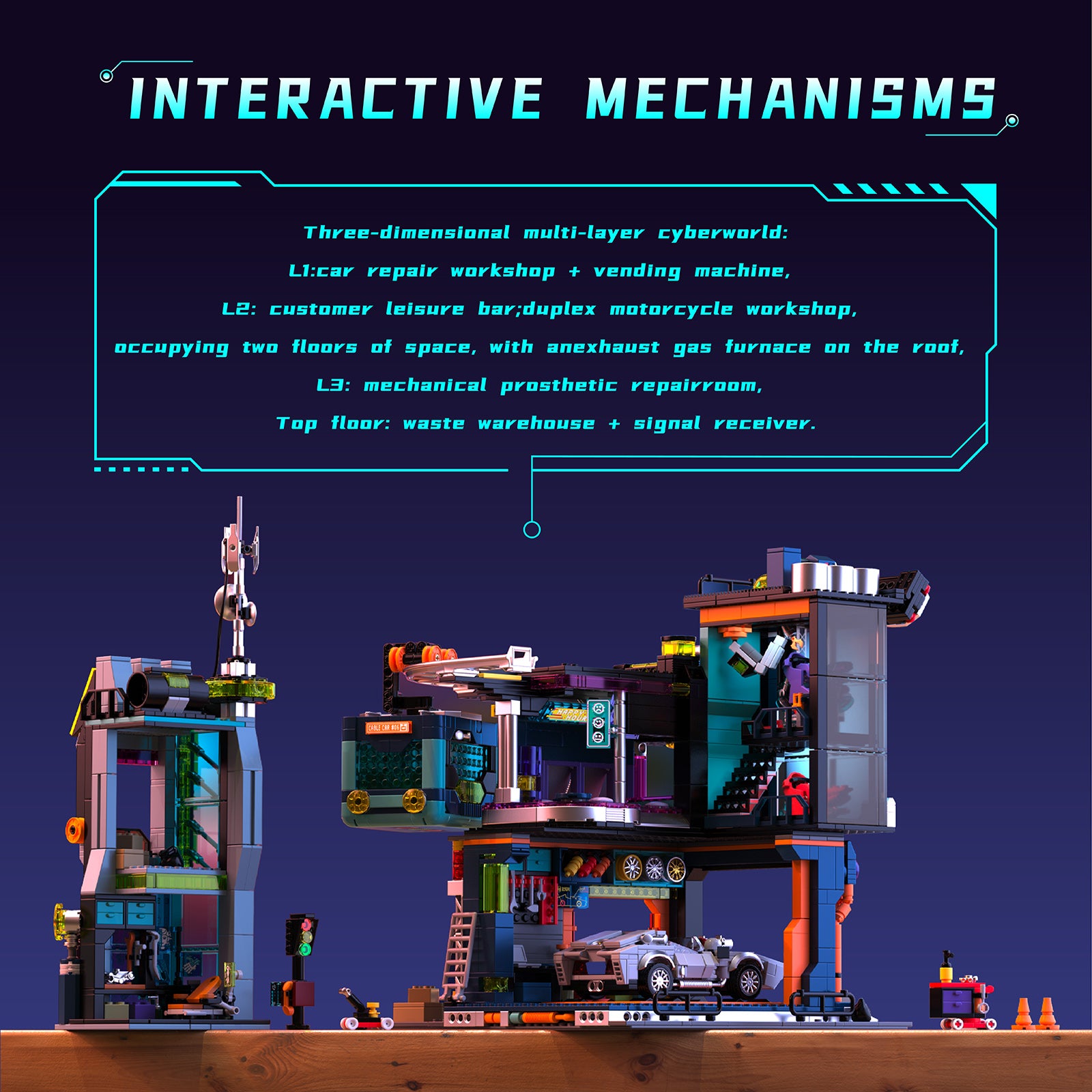 Cyber Elements: A complex motorcycle repair shop, a robot repair room, a lounge, a car repair shop and a warehouse, showing the cyberpunk style of future urban life in multiple dimensions.